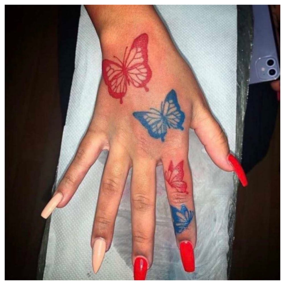 Butterfly tattoo designs in blue can make a great small butterfly tattoo hand art as shown here. Dividing the butterfly in two allows. Red butterflies are also symbolic themselves to many cultures.