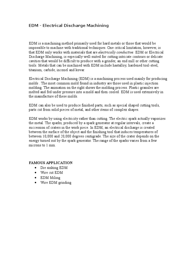 Electrical Discharge machining EDM is a comparatively new machining method which has several decades of history since it has been invented. Some of them include. Electrical discharge machining is a machining method primarily used for hard metals or those that would be very difficult to machine with traditional techniques.